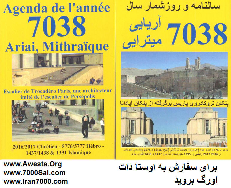 برترین دفتر پر افتخار انسان آریایی از تاجیکستان و ازبکستان و ایران و آذربایجان و ارمنستان تا اسراییل و تا سراسر جهانی که انسان آزاده اریایی زندگی میکند ما در سال 7037 آریایی میترایی هستیم سال 1394 هنگام گریز پیامبر تازی از روستای مکه به ده یثرب است که در پی آن ویرانی فرهنگ و تمدن ایران آیا نباید ننگمان باشد از بهره بردن از چنین تاریخی؟ برای سفارش نسخه چاپی این سالنامه و دیگر آثار سیاوش اوستا به اوستا دات نت بروید و یا در گوگل سفارش آثار سیاوش اوستا را جستجو کنید www.Awesta.Net برای دیدن کل سالنامه 7036 آریایی میترایی و تمامی آگهیها اینجا کلیک کنید برای آسودگی شما و گریز از فیلترها چند لینک ذیگر نیز در اختیار شماست در سالنامه هفت هزارساله شرح ساخت تمامی سالنامه های رایج آمده است و شما بیش از 5 هزار نام و یادروز و نشان یاران ایرانی در سراسر جهان بویژه نیازمندیهای ایرانیان فرانسه از پزشک و انجمن و وکیل و مترجم و رستوران و فروشگاه و غیره را در دسترس دارید شما میتوانید این سالنامه را دانلود کرده و روی کامپیوتر و تلفن دستی و ایپد خود برای همیشه داشته و هر روز از ان بهره ببرید بویژه اصحاب رسانه و رادیو و تلویزیون و برنامه سازان برای یافتن یاد روزها میتوانند به این سالنامه نگاهی بیندازند استخراج این سالنامه بیشترین وقت و انرژی را از ما میگیرد و هدیه ایست بشما مهربان یاران از سالیان سال تمامی یادروزهای هنرمندان اندیشمندان و بزرگان ایرانی و کلیه جشنهای آریایی را در این سالنامه دارید و نیز در پایان سالنامه هنگامه دیگر شدن سال آینده را نیز ار هم اکنون در دسترس دارید یاد روزها و پانویسها و استخراج و تنظیم این سالنامه پر افتخار از استاد سیاوش اوستا است ّ بهای دو عدد د ده یورو |