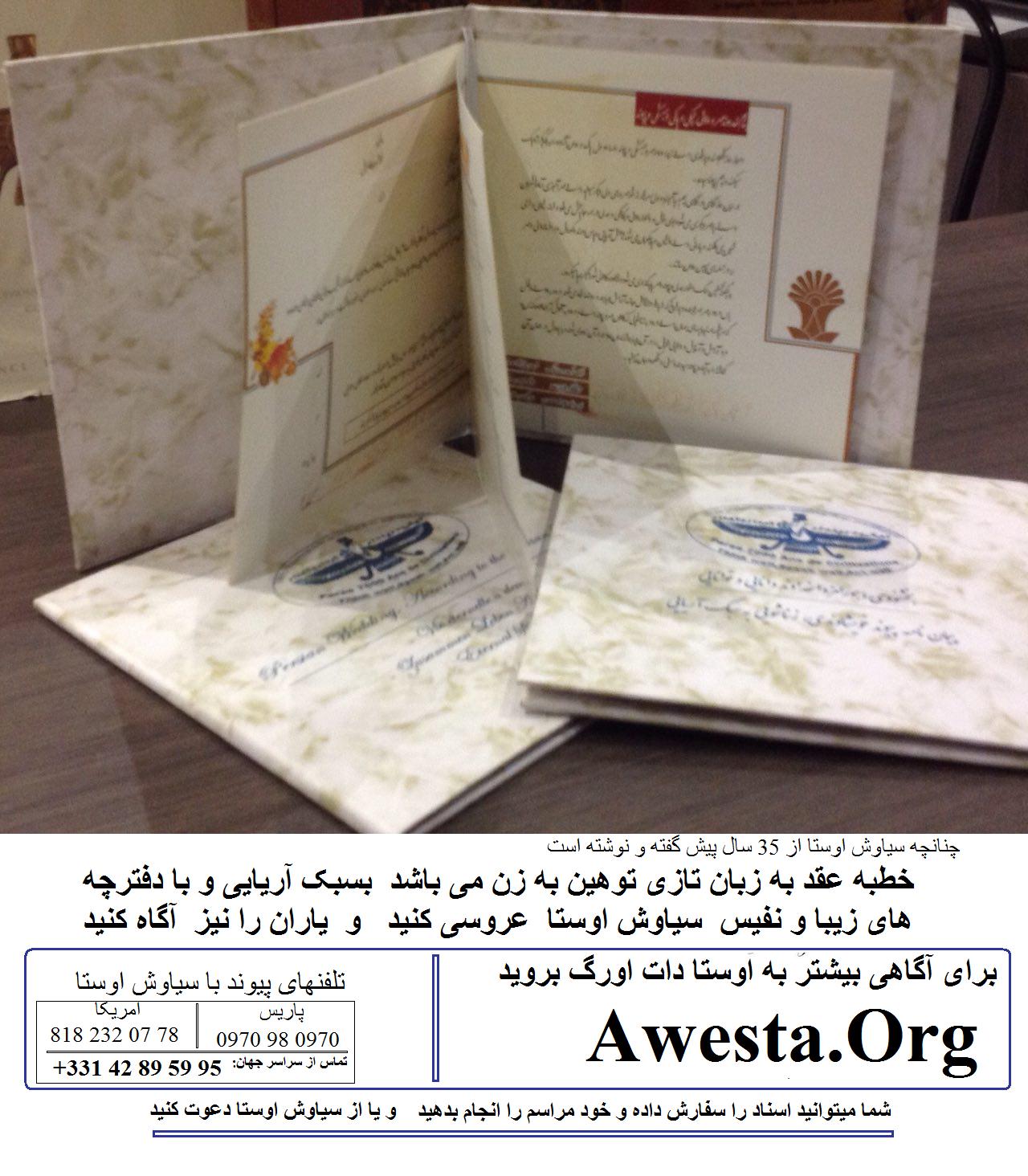 خطبه عقد و عروسی بزبان تازی توهین به شخصیت زن است از هر دین و آیین و قومی که هستید زیبا آبرومند و پر افتخار و بسبک آریایی عروسی کنید و برای یک عروسی آریایی در سراسر جهان این برگ را خوب بخوانید و لیست آثار سیاوش اوستا را برای خرید ببینید |